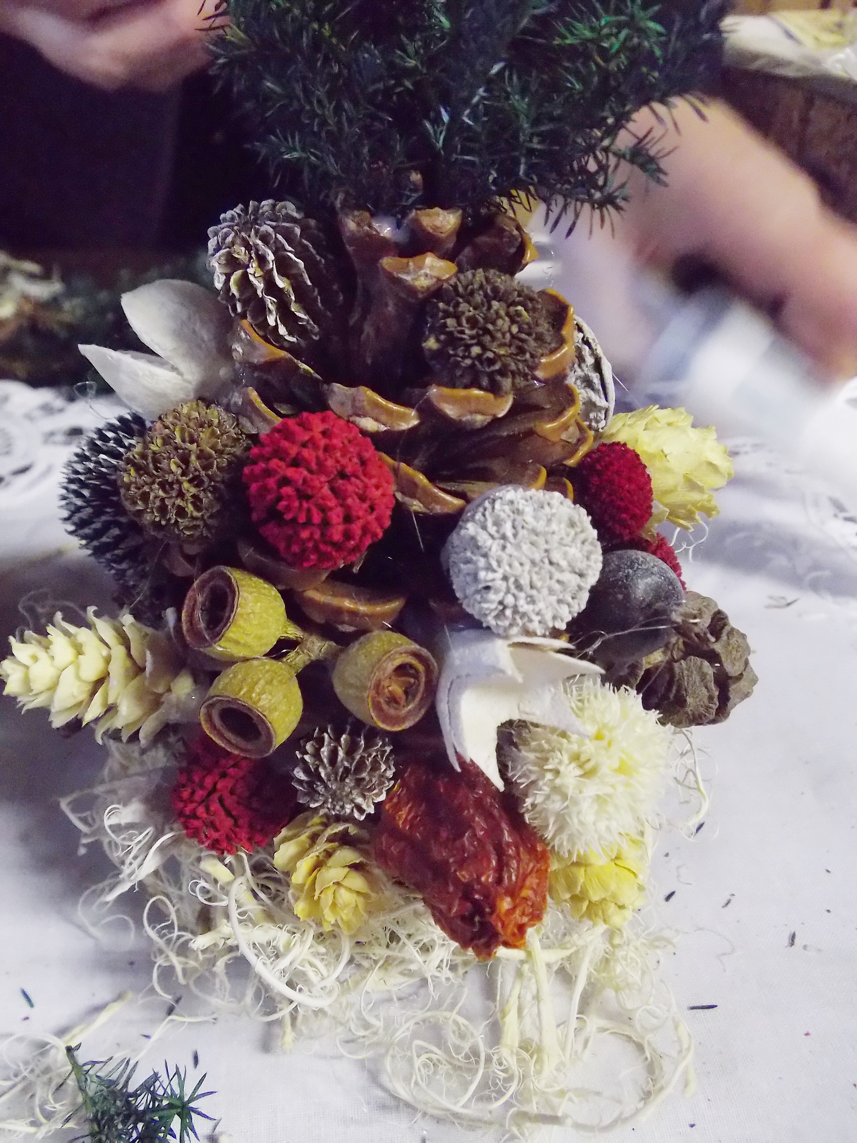 手のひら大の松ぼっくりをクリスマスツリーに見立てて、このように土台を作り、そこへ様々な木の実を自由に糊でくっつけていきます。
